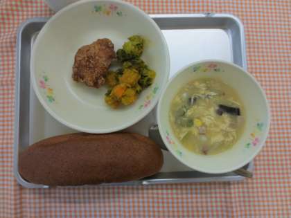 6月20日(木) 今日の給食 公開日 2013/07/18 更新日 2013/07/18 給食の献立 献立名 ・胚芽パン ・鶏肉の変わり揚げ ・ホットサラダ ・中華風コーンスープ ・牛乳 今日は、鶏肉の変わり揚げでした。下味に、ごま油とさとうを加え、でんぷんと小麦粉を混ぜた粉で唐揚げにしました。 ホットサラダは、ブロッコリーとにんじん、カボチャを使いました。 いいね(0)