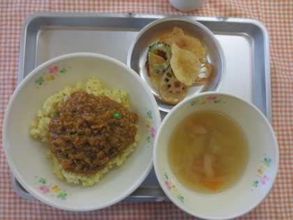 9月11日(水)今日の給食 公開日 2013/09/20 更新日 2013/09/20 給食の献立 献立名 ・ドライカレー ・コンソメスープ ・野菜チップス ・牛乳 今日は、ドライカレーでした。 野菜チップスは、じゃがいもと、レンコンとゴーヤの3種類の野菜を使いました。 いいね(0)