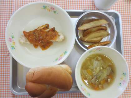 9月27日(金)今日の給食 公開日 2013/10/15 更新日 2013/10/15 給食の献立 献立名 ・ショートニングパン ・白身魚のガーリックソースかけ ・くしがたポテト ・ABCスープ ・牛乳 今日は、白身魚にメルルーサを使いました。唐揚げにした後、トマトとにんにくを使ったソースをかけました。くしがたポテトは、オーブンで焼き上げました。 いいね(0)