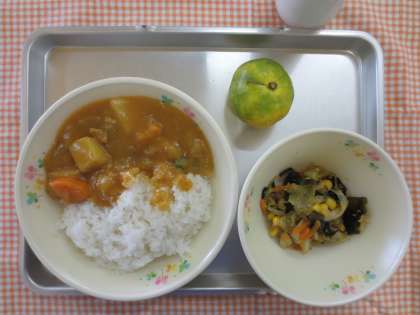 10月9日(水)今日の給食 公開日 2013/10/15 更新日 2013/10/15 給食の献立 献立名 ・カレーライス ・和風サラダ ・みかん ・牛乳 今日は、カレーライスでした。学校のカレーは、ルーから手作りしています。隠し味にすりおろしたりんごを加えています。 いいね(0)