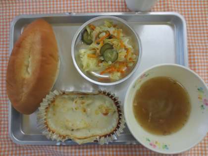 10月16日(水)今日の給食 公開日 2013/10/27 更新日 2013/10/27 給食の献立 献立名 ・ソフトフランスパン ・ポテトグラタン ・イタリアンサラダ ・オニオンスープ ・牛乳 今日は、ポテトグラタンを手作りのホワイトルーで作りました。グラタンは、おこげという意味があります。やさしい焼き色にできました。 オニオンスープは、玉ねぎをじっくり痛めてから2時間位いに煮込みました。 いいね(0)