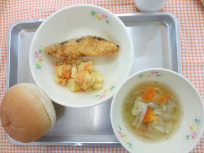 10月22日(火)今日の給食 公開日 2013/10/27 更新日 2013/10/27 給食の献立 献立名 ・フィッシュサンド ・もみじポテト ・野菜スープ ・牛乳 今日は、もみじポテトを作りました。紅葉のもみじをイメージして作った粉吹き芋です。鮮やかな赤は、にんじんを細かくしてバターで味付けし表しました。高尾山もだんだん黄色やオレンジ色に色づいてきました。 いいね(0)