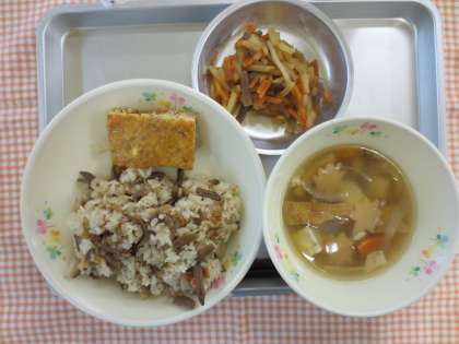 今日は、とりごぼうご飯でした。ご飯に、ごぼうを使ったので、きんぴらは、じゃがいもの千切りを使いました。