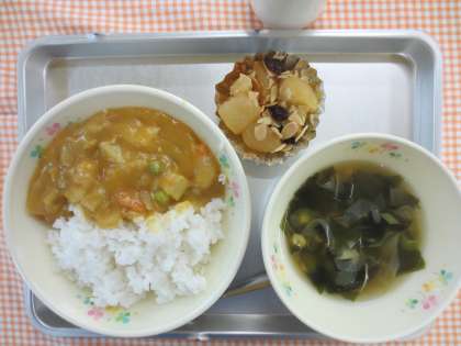今日は、りんごのアーモンド焼きでした。りんごは、生で食べてもおいしいのですが、今日はりんごに生クリームとレーズン、さとうをまぜて、おアーモンドをのせてオーブンで焼きました。
