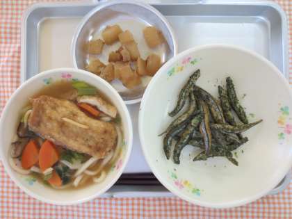 1月10日(金)今日の給食 公開日 2014/01/23 更新日 2014/01/23 給食の献立 献立名 ・五目うどん巾着餅入り ・ごま大根 ・きびなごの唐揚げ 1月11日は、鏡開きです。お供えしてあった鏡餅を手や木槌で割ってお雑煮やお汁粉にして食べるお正月の行事食です。餅は歳神様が宿っているといわれているので、神様と縁を切らないように『割る』や『砕く』とは言わずに『開く』と言います。給食では、油揚げに丸餅を入れて巾着にしました。 いいね(0)
