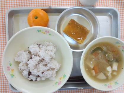 1月15日(水)今日の給食 公開日 2014/01/23 更新日 2014/01/23 給食の献立 献立名 ・あずきごはん ・豆腐の田楽風焼き ・みぞれ汁 ・みかん ・牛乳 1月15日は、小正月です。この日は、小豆粥を食べる風習があります。小豆の赤が、邪気を払い、1年間万病を防ぐといわれているようです。給食では、この1年の皆さんが健康でいられるように願ってあずきごはんを作りました。 いいね(0)