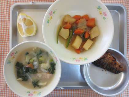 今日は、みそすいとんです。戦時中から終戦の食糧事情の悪い日本で、主食の米にかわる代用食として食べられていたものです。給食用のすいとんには、小麦粉のほかに白玉粉や、ごま、野菜もたっぷり入り、煮干しでだしを取っています。当時はほとんど何も入っていなかったようです。今は、ありがたいですね。