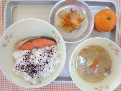 1月24日(金)今日の給食 公開日 2014/02/17 更新日 2014/02/17 給食の献立 献立名 ・ゆかりごはん ・鮭の塩焼き ・豚汁 ・ゆず大根 ・みかん ・牛乳 今日は、給食週間の最後の日です。日本の、給食の始まりは、明治22年(1889年)に山形県の忠愛小学校で出されたものが始まりといわれています。その時の献立は、おにぎりと焼き魚とつけものでした。今日は、それにちなんで鮭の塩焼きにしました。 いいね(0)