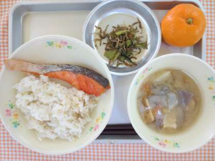 今日は、五穀ごはんでした。米、麦、あわ、豆、きびなど五種類を混ぜたものを、五穀米といいます。また、五穀豊穣と言って、穀物が豊かに実ることをいう場合もあります。白米で食べるよりも食物繊維やミネラルもとれます。今日は、米、もち米、玄米、麦、きびを入れました。色、形の違いを見ながら味わってもらえたらいいと思います。