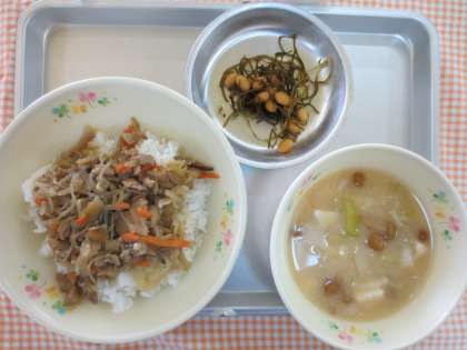2月10日(月)今日の給食 公開日 2014/02/17 更新日 2024/12/17 給食の献立 献立名 ・豚肉のすき焼き丼 ・ぶどう豆 ・なめこ汁 ・牛乳 今日は、なめこ汁でした。なめこの食べ方で思いつくのは、やはりなめこ汁です。なめこは、ぬめりが独特です。なめこには、ミネラルも豊富です。今日は、煮干しでだしを取り、赤みそと白みその合わせみそにしました。 いいね(0)
