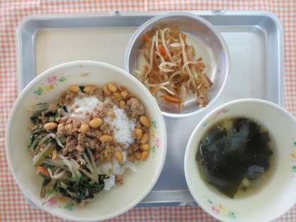 今日は、ビビンバでした。ビビンバは、韓国の料理です。給食のビビンバは、栄養を考えて、オリジナルな材料でつくるときもあります。今日は、肉そぼろの中に、大豆を入れたバージョンです。大豆は、豆腐にもなるヘルシーなのに、良質なたんぱく質が多い食べ物です。本来ビビンバは、野菜などと混ぜて食べます。