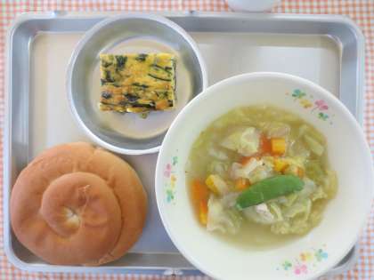 今日は、ほうれん草のキッシュでした。キッシュは、卵と生クリームを使って作るフランスの郷土料理です。パイ生地作った器の中に具を入れ、オーブンで焼きいれたものです。今日は、旬のほうれん草にベーコンを加えたっぷりの牛乳と生クリームで作りました。ほうれん草は、冷え込むと柔らかくなり、味もよりおいしくなり、ビタミンもアップするそうです。今日のほうれん草は、東京の東久留米で採れたものです。