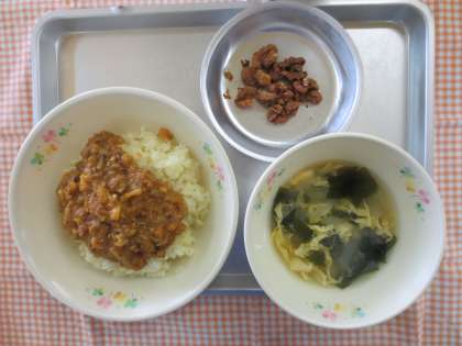 2月25日(火)今日の給食 公開日 2014/03/15 更新日 2014/03/15 給食の献立 献立名 ・根菜ドライカレー ・わかめと玉子のスープ ・くるみ黒糖 ・牛乳 今日は、人気の根菜ドライカレーでした。にんじん、たまねぎ、干ししいたけの他に、今が旬のれんこんとごぼうを入れました。カレーは、いろいろな野菜を入れるとよりおいしいです。苦手野菜もカレー味で克服できそうですね。今日のカレーは、旬の香りや触感を楽しめカレーでした。 いいね(0)