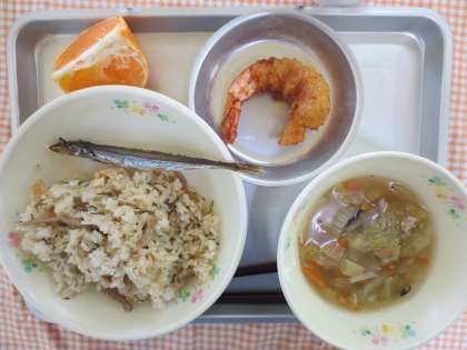 3月18日(火)今日の給食 公開日 2014/03/21 更新日 2014/03/18 給食の献立 献立名 ・ししじゅうし ・くずきりスープ ・焼きししゃも ・エビフライ ・せとか ・牛乳 今日は、ししじゅうしでした。ししじゅうしは、沖縄料理です。ししは『豚肉』、じゅうしいは『まぜご飯』の意味です。沖縄料理の特徴として、豚肉と海藻がよく使われます。しょうがのきいたさっぱりとした味付けになっています。 いいね(0)