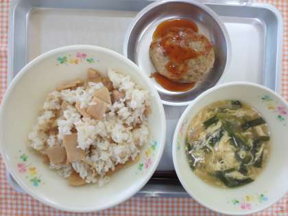 今日は、たけのこごはんでした。たけのこは、春の代表的な野菜です。たけのこは、掘りおこさずにそのまま成長させると、立派な竹になります。芽が出てから10日ほどで竹になるくらい成長がはやいそうです。おなかの調子をよくしてくれる食物繊維と、体の中にある余分な塩分を外に出してくれるカリウムが含まれています。