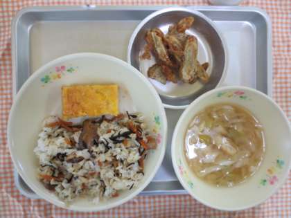 5月7日(水)今日の給食 公開日 2014/05/10 更新日 2014/05/08 給食の献立 献立名 ・ひじきごはん ・卵焼き ・みそ汁 ・ごぼうチップス ・牛乳 今日は、ごぼうチップスを作りました。新ごぼうと言われるのは、ちょうど4月から5月にかけて出回ります。今日は、油で揚げて、さとう、しょうゆ、みりんのたれをかけました。 いいね(0)