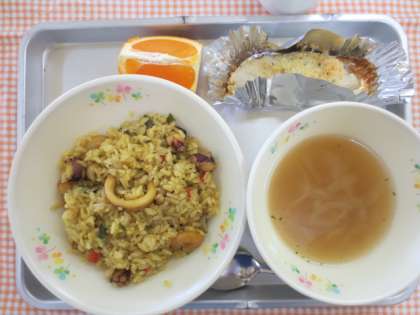 5月19日(月)今日の給食 公開日 2014/05/23 更新日 2014/05/23 給食の献立 献立名 ・パエリア ・白身魚のチーズパン粉焼き ・オニオンスープ ・きよみ ・牛乳 今日は、パエリアを作りました。パエリアは、米どころとして知られるスペインのバレンシア地方の料理です。米と野菜、魚介類、肉などを炊き込んだスペインを代表する料理です。パエリアは、フライパンという意味です。今日は、むきえび、イカ、タコを使って作りました。 いいね(0)