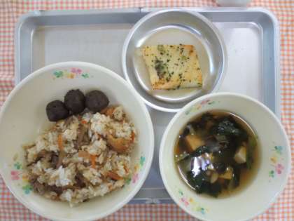 5月29日(木)今日の給食 公開日 2014/06/01 更新日 2014/05/29 給食の献立 献立名 ・とりごぼうピラフ ・きのこ汁 ・いかのハーブ焼き ・玉こんにゃくの土佐煮 ・牛乳 今日は、とりごぼうピラフでした。ごぼうは、熊本で採れた新ごぼうを使いました。この時期のごぼうは、かおりがよく、少し細めです。 玉こんにゃくの土佐煮は、さとうと、しょうゆ、酒で煮込み、仕上げにかつお節粉をかけました。実は、5月29日は、こんにゃくの日です。 いいね(0)