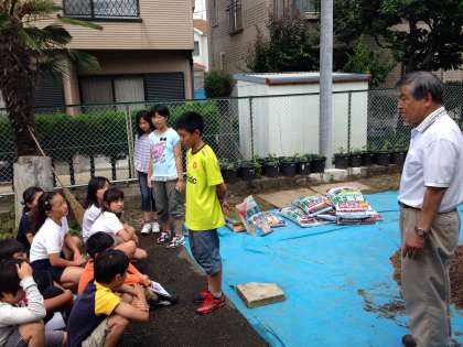 今年も菊作りが始まりました。上田先生(元校長先生)が六年生のために指導しに来てくださいました。
