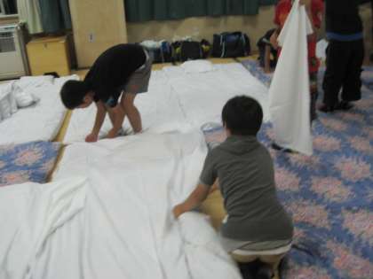 校内宿泊(みどり学級)7 公開日 2014/06/14 更新日 2014/06/13 五小の生活 夜は寝る準備をするために自分たちで布団を敷きます。班内で「○○くん手伝って」などと声を掛けて皆で協力して布団敷きができました。事前学習したこともあり、全ての布団を子供たちだけで準備しました。さすがみどり学級の子供たちです。 これで一日目終了。次の日も最後まで頑張ってくれることを願います。 (小山) いいね(0)