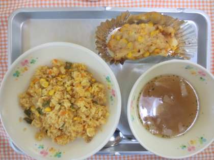 今日は、メキシカンライスでした。メキシカンライスは、メキシコ料理でトマトとチリパウダーを使い、スパイシーに仕上げるトマト風味の炊き込みピラフです。給食では、コーンやピーマンなどの材料も入れて出来上がりも楽しめるように作りました。
