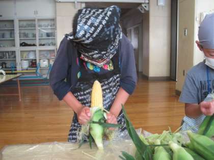 7月2日(水)の一時間目にみどり学級はとうもろこしの皮むきをしました。栄養士の中村先生がとうもろこしについて、教えてくださり、楽しみながら体験できました。今回むいたとうもろこしが、給食で出たため、子ども達は大喜び。また、給食のお手伝いをしたい!と言っていたみどり学級の子供たちです。