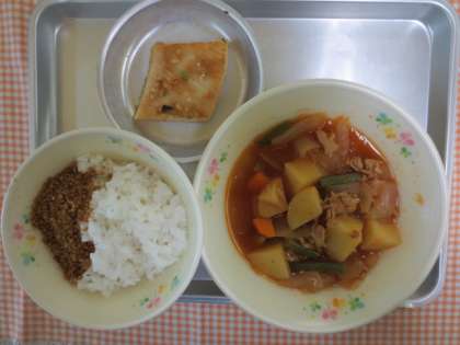 7月11日(金)今日の給食 公開日 2014/07/12 更新日 2014/07/11 給食の献立 献立名 ・ごはん ・ふりかけ ・いかの香味焼き ・トマト肉じゃが ・牛乳 今日は、トマト肉じゃがを作りました。肉じゃがの煮汁にホールトマトを使って煮込んでみました。少し酸味があって、煮汁も赤みが加わりました。 いいね(0)