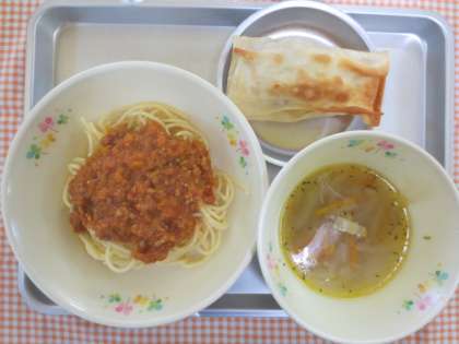 今日の給食は、スパゲティーミートソースでした。とても人気のメニューでしたので、とてもよく食べてくれました。