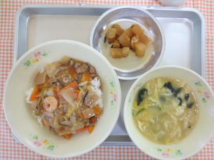 9月19日(金)今日の給食 公開日 2014/09/26 更新日 2014/09/26 給食の献立 献立名 ・中華丼 ・カクテキ ・コーンと卵の中華スープ ・牛乳 今日は、カクテキを作りました。カクテキは、大根のキムチ漬けのことです。給食では、大根をサイコロに切ってさっとゆでた後、白菜キムチとしょうゆ、ごま油で味付けしました。 いいね(0)