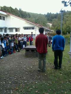 すぐに開校式。ハイキングで30分の遅れを取り戻した5年生の集団行動はスゴい。と誉めました。