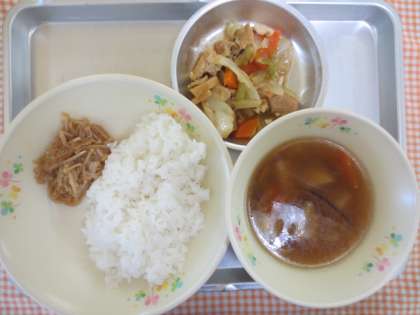 9月22日(月)今日の給食 公開日 2014/09/26 更新日 2014/09/26 給食の献立 献立名 ・ごはん ・厚揚げと豚肉の味噌炒め ・なめたけ ・根菜汁 ・牛乳 今日は、なめたけを作りました。なめたけは、えのきだけを、酒、しょうゆ、みりん、さとう、塩で味付けをしました。 いいね(0)