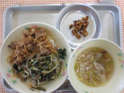 10月9日(木)今日の給食 公開日 2014/10/23 更新日 2014/10/23 給食の献立 献立名 ・ビビンバ ・春雨スープ ・くるみ黒糖 ・牛乳 今日は、ビビンバを作りました。ビビンバは、韓国の混ぜご飯です。ごはんの上に、ナムルや肉、卵などをのせてよくかき混ぜて食べる料理です。給食では、肉と一緒に切り干し大根を入れています。 いいね(0)