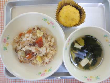 今日は、10月10日ということで、目の愛護デーです。給食では、目にいいビタミンAの多いにんじんを使ってにんじん饅頭を作りました。上新粉と小麦粉、アーモンド粉、ベーキングパウダーを混ぜた中にふかしてミキサーにかけたにんじんと、ヨーグルト、たまご、牛乳を加えて生地を作り、アルミカップに生地と小豆あんを入れてむしあげました。