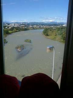 立川南駅からモノレールに乗ります。モノレールから多摩川が見えました。やはり水量が多く、濁っていました。