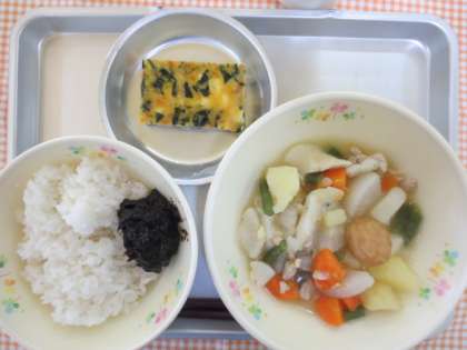 10月17日(金)今日の給食 公開日 2014/10/23 更新日 2014/10/23 給食の献立 献立名 ・ごはん ・千草焼 ・洋風おでん ・のりの佃煮 ・牛乳 今日は、千草焼を作りました。鶏のひき肉に、卵、プロセスチーズ、玉ねぎ、ほうれん草、にんじんが入っていました。給食では、オーブンで焼いて、切り分けて出しました。 今日は、ほうれん草が、八王子の石川町、大根が八王子の小比企町で採れた野菜を使いました。 いいね(0)