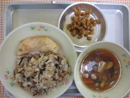 「かやくごはん」は、八王子の大学を卒業したベースのたなしんさん・・・ひじきを食べて元気!給食で食べたまぜご飯がおいしくて「ひじき」が食べられるようになりました。みんなと一緒に食べるとおいしいね!もりもり食べて、元気に過ごそう。