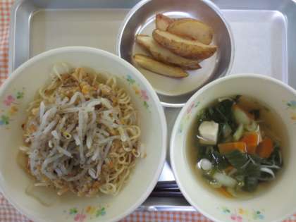 9月8日(火)今日の給食 公開日 2015/09/11 更新日 2015/09/11 給食の献立 献立名 ・ジャージャー麺 ・チンゲン菜と豆腐のスープ ・ベイクドポテト ・牛乳 今日は、ジャージャー麺を作りました。 豆板醤を使って少しピリ辛になっています。 いいね(0)