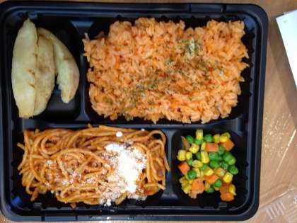 お弁当屋さんにお願いをして、チキンライス、ナポリタン、彩り野菜、ポテトの入ったお弁当を食べました!