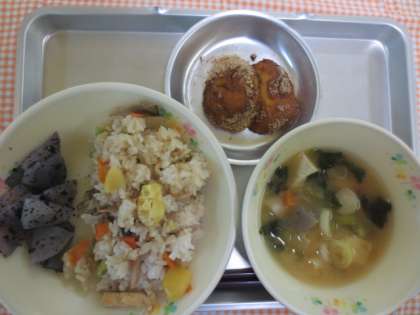 今日は、27日の十五夜にちなんで、お月見献立です。お月見は、秋の収穫に感謝する意味もあり、稲に見立てたススキを飾ったり、団子や里芋を供えて豊作を祈ります。里芋を供えることから、「芋名月」とも呼ばれます。月見団子は、きな粉と黒蜜をかけました。