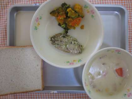 10月28日(水)今日の給食 公開日 2015/11/18 更新日 2015/11/18 給食の献立 献立名 ・パン ・コーンチャウダー ・主菜リザーブ香草パン粉焼き(鶏肉かあじ) ・温野菜サラダ ・牛乳 今日は、主菜リザーブの日でした。主菜は、メインのおかずのことで、主に肉、魚、卵などのおかずです。その働きは、体を作ることで、血液や筋肉、骨を作り、強くします。 香草パン粉焼きは、にんにく、パセリ、バジルを使いました。 いいね(0)