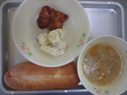 7月4日(月)今日の給食 公開日 2016/07/22 更新日 2016/07/22 給食の献立 献立名 ・ソフトフランスパン ・バーベキュードチキン ・ポテトカルボナーラ ・ジュリエンヌスープ ・牛乳 今日は、ジュリエンヌスープを作りました。「ジュリエンヌ」とはフランス語で「千切り」のことです。玉ねぎ、にんじん、キャベツを千切りにしてスープにしました。 いいね(0)
