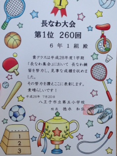 以前にもお伝えしましたが、第1位は6年1組でした。2分間で260回も跳ぶことができました。