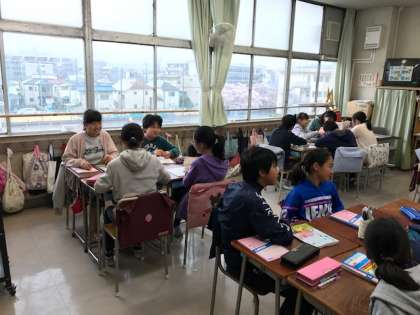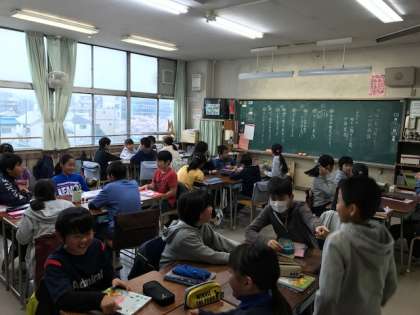 始めと終わりだけ決めて、リレー形式でお話作り。なかなか難しいけれど、人の話を聞く、つながりを考えるよい学習です。