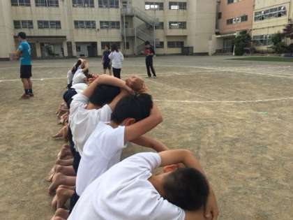 校庭の砂利が膝に当たって痛いけれど、見ている人に感動してもらうために、へっちゃらな顔で練習をしている5・6年生。