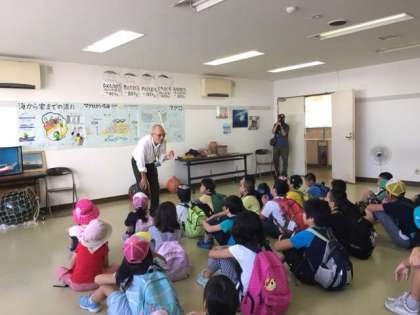 マグロの秘密や不思議についての講話がスタート。実物を見た後もあってか興味津々。 みどり 香川雄亮