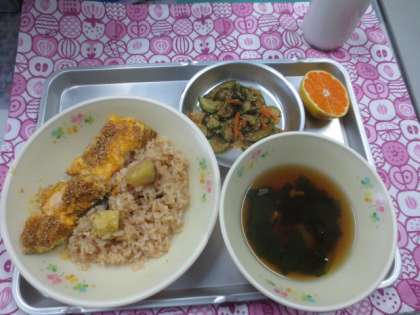 きょうの給食9月29日(金) 公開日 2017/10/02 更新日 2017/10/02 給食の献立 八王子市制100周年お祝い献立 くりごはん 夕焼小焼やき やさいのおかかあえ 桑の葉だんご汁 くだもの(菊花みかん) 牛乳 八王子のお祝い献立です。夕焼け小焼けの里の話や歌のこと、桑の都と呼ばれていることなどたくさん話しながら教室をまわりました。夕焼小焼やきが大好評でした。ふるさと八王子のはなしをしながらおいしく過ごせた給食時間でした。 いいね(0)