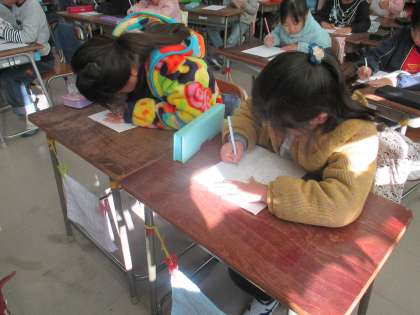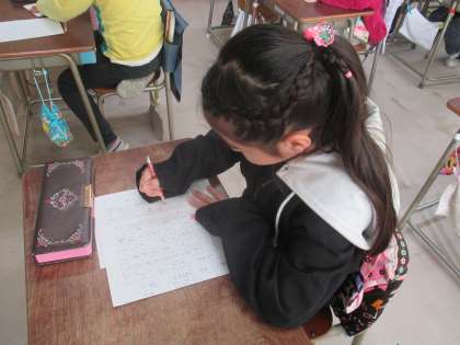 書初めの本番をしました。 お手本をよく見て、 集中して 丁寧に書きます。 2年生担任 知見 直明