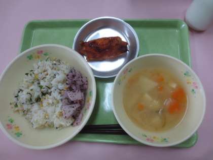 今日の献立は、「菜の花ごはん」「鶏の照り焼き」「みそ汁」「ゆかり大根」「牛乳」です。