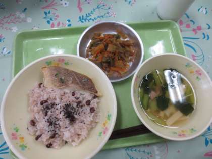 今日の献立は、入学・進級のお祝い献立で「赤飯」「赤魚の西京焼き」「きんぴら」「春のお吸い物」「牛乳」でした。