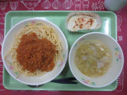 今日は、子どもたちの人気メニュー「スパゲティミートソース」と「春キャベツのスープ」「ポテトのチーズ焼き」「牛乳」です。